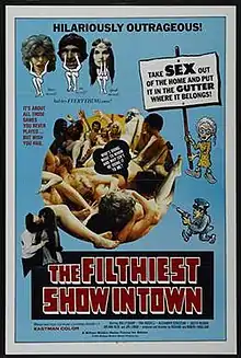 The Filthiest Show in Town is a 1973 satirical exploitation comedy film directed by Richard Endelson and Robert A. Endelson. It stars Sandra Peabody, Tina Russell, and Harry Reems.[1] The story follows the owners of the National Genital Television Network who go on trial over backlash of one of their highest rated shows: the adult dating show entitled The Maiden Game. The story follows several other vignettes in the form of disjointed commercial segments. Initially, the film was promoted by the extensive media coverage of adult film stars Russell and Reems, the latter having just starred in the mainstream adult film Deep Throat (1972). Subsequently, it was promoted by the notability of Peabody who had just starred in Wes Craven's critically acclaimed horror film The Last House on the Left (1972).