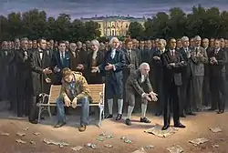 The Forgotten Man is a 2010 painting by the American artist Jon McNaughton.[3] It depicts then President Barack Obama standing in front of the White House beside a destitute citizen while being haunted by figures of all past presidents.[4] The subject matter of the painting was inspired by the passage of the Affordable Care Act.[2] McNaughton unveiled the painting in a YouTube video on September 14, 2010.[5] It was the second in a series of politically charged portraits painted by McNaughton.[6] The painting, along with subsequent works by McNaughton, have attracted notoriety by fans for their unsubtle political themes, while critics have focused on their perceived "so bad it's good" qualities.