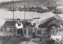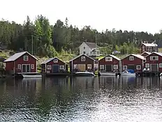 At the outset, the families of the fishermen resided in simple log houses featuring a single room and a fireplace built from natural stone. Furnishings were limited to essential items like beds, tables, and chairs. After each fishing trip, the fishermen would haul their boats ashore. As time progressed, houses became more elaborate, boasting multiple rooms and built from wooden boards. Nevertheless, their interiors remained rather modest. In a typical fishing village during the early 19th century, sheds encircled a bay, with boats resting on the adjacent beach and dwellings situated above them.[18] Boathouses designed for shelter from inclement weather were only erected towards the end of the 19th century, with some of the older sheds being converted for this purpose. These sheds, oriented with their gables facing the water, served as storage spaces for vats, barrels, and tools. On the water-facing side, they featured docks for the loading and unloading of boats. Originally, these dwellings and sheds were unpainted; it was not until the early 20th century that they adopted the distinctive Falun red color.[19]