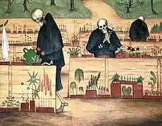 The Garden of Death (Finnish: Kuoleman puutarha; 1896) is a painting by Finnish symbolist painter Hugo Simberg. Like many of Simberg's paintings, it depicts a gloomy, otherworldly scene. The central figures are reminiscent of the classic black-clad Grim Reaper, but paradoxically are tending to gardens; traditionally symbols of birth or renewal.