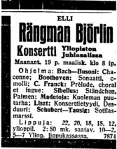 - H. K. [Klemetti, Heikki] [in Finnish] (20 March 1923). "Elli Rängman-Björlinin konsertti" [Concert by Elli Rängman-Björlin]. Uusi Suomi (in Finnish). No. 65. p. 9.