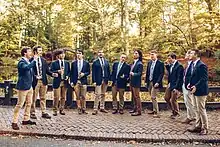 The Gentlemen of the College is a Tenor/Bass singing group, and the oldest Tenor/Bass a cappella group at the College of William & Mary. Founded in 1990[1] the Gentlemen started out as a men's choir that concentrated in barbershop and traditional pieces—a repertoire that has since evolved to encompass a large selection of contemporary music. Known for their navy blazers, khaki pants, and novelty ties, the Gentlemen perform at the collegiate, local, and national level. The Gentlemen usually field four 'fixed' concerts per year—a Homecoming concert in the Sadler Center, Two "Wren 10"s on the portico of the Wren Building, and a final concert in Phi Beta Kappa Memorial Hall[1] Additionally, the Gentlemen have performed on national television,[2] at The White House,[3] The Capitol[3] the Waldorf Astoria,[4] and for Queen Elizabeth II of the United Kingdom.[3] The Gentlemen have 21 studio CDs in their discography, having just released their most recent album, YuleTied, in 2023.[5]