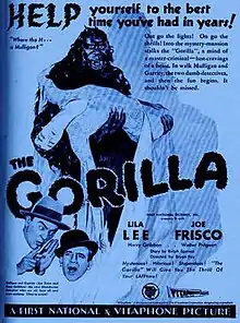 The Gorilla (1930) is an American pre-Code mystery-comedy film produced by First National Pictures, distributed by Warner Bros., and directed by Bryan Foy. It stars Joe Frisco, Harry Gribbon, Walter Pidgeon and Lila Lee, and is based on the 1925 play of the same name by Ralph Spence. The 1930 film version was a sound remake of the 1927 silent version, also produced by First National Pictures.[1]