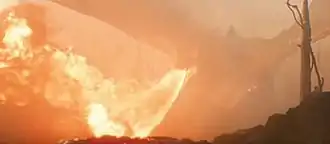 The Finnish film director Dome Karukoski's 2019 biographical drama film Tolkien narrates Tolkien's early life and wartime experiences. It depicts him in delirium with trench fever on the front line,[39] beginning "to hallucinate scenes from the books he is yet to write",[40] and thus visually linking the war to his legendarium. In a vision, perhaps dreamed, in a smoky, dark and chaotic no man's land of mud and shattered tree-stumps, he sees not a Flammenwerfer but a fiery dragon before him.[38][39] He also has a batman named Sam.[38] Sheila O'Malley, reviewing the film for the film criticism website RogerEbert.com, comments that having Tolkien literally "see[ing] dragons and what would eventually become the Eye of Sauron and the Nazgûl, unfurling across the hellscape of No-man's-Land ... is a very reductive approach to literature". Worse, in O'Malley's view, is that by explicitly showing the Somme as "'inspiration'" (her quotation marks) for Middle-earth, the film "diminish[es] both the battle and the books".[1]