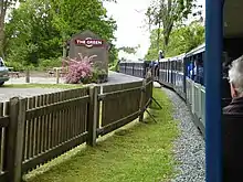 The Green is a railway station on the 15-inch gauge Ravenglass & Eskdale Railway in the Lake District National Park and the English county of Cumbria. The station is situated on the southern edge of the village of Eskdale Green, overlooking the Eskdale valley and Muncaster Fell.[1] It was originally known as King of Prussia after the nearby public house, and later as Eskdale Green. The Eskdale Green name has continued in popular use, and was still in official use in 2017 (as it was in previous years) in the railway's "full" timetable of intermediate stopping places.[2]