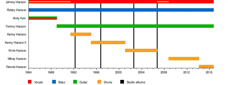 - Robbie Hanson (Rob Wright) – bass guitar (1984–2016)