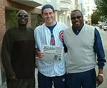 ![]() Founder of The Heckler poses in 2003 with Cubs coach Gary Matthews (left) and manager Dusty Baker (right). | |