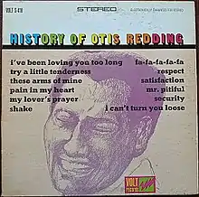 The History of Otis Redding is the first of numerous compilations of Otis Redding songs, featuring hits from 1962 to early 1967. Released one month prior to Redding's death in December 1967, it was the final album (and only compilation album) issued during his lifetime.