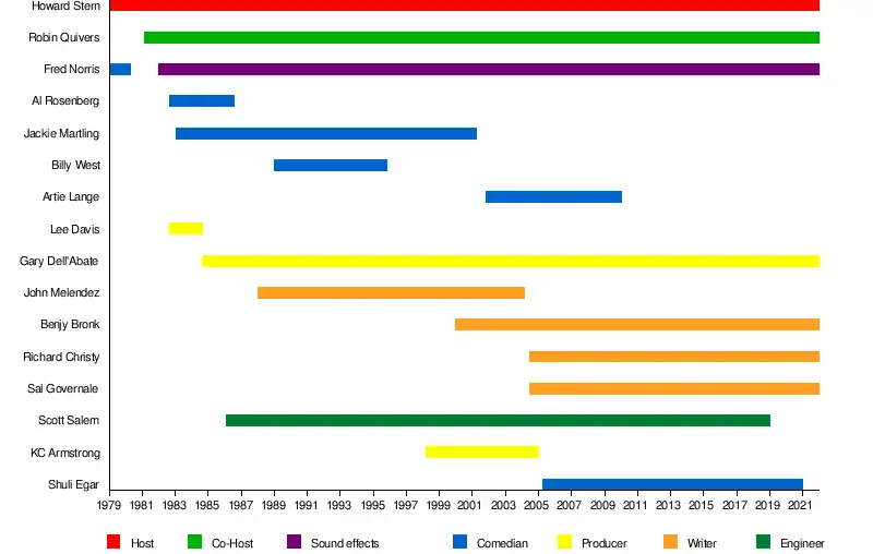 In addition to their regular behind-the-scenes responsibilities, some show staff regularly appear on-air with Stern for comedy bits, conversations with Stern and Quivers, and a variety other content.