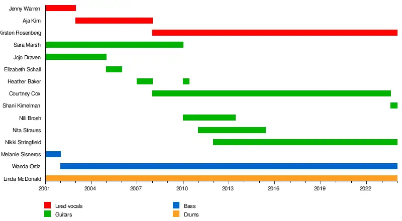 In summer 2008, Heather Baker and Aja Kim left the band to pursue solo careers.[10] The two were replaced by guitarist Courtney Cox and vocalist Kirsten Rosenberg (formerly of the Maryland-based cover band HighWire).[11] In January 2010, Marsh, who was ill, was taken off some of the Japanese tour shows and did not rejoin the band.[12] Baker rejoined the band to temporarily fill in Marsh's spot for a handful of shows.[12]