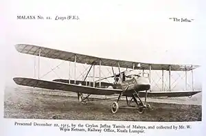 The Jaffna (MALAYA No. 11 (Fighter) The Jaffna) was a Royal Aircraft Factory F.E.2 aircraft of the Royal Flying Corps.[1] It was given to the British Government during World War I by Ceylonese Tamils who had emigrated from Jaffna to Malaya, on 22 December 1915.[2] The Jaffna was allocated to No. 25 Squadron.[3][4][5]