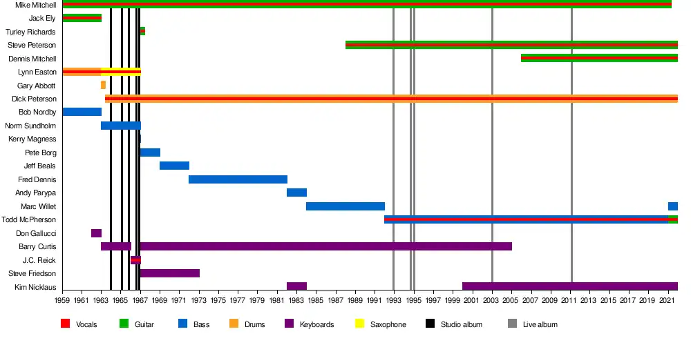 - Lynn Easton – vocals, drums, saxophone (1959–1967; died 2020)[7]