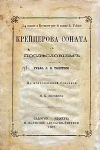 The Kreutzer Sonata (Russian: Крейцерова соната, Kreitzerova Sonata) is a novella by Leo Tolstoy, named after Beethoven's Kreutzer Sonata. The novella was published in 1889, and was promptly censored by the Russian authorities. The work is an argument for the ideal of sexual abstinence and an in-depth first-person description of jealous rage. The main character, Pozdnyshev, relates the events leading up to his killing of his wife: in his analysis, the root causes for the deed were the "animal excesses" and "swinish connection" governing the relation between the sexes.[1][2]
