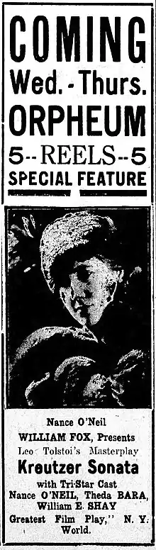 The Kreutzer Sonata is a lost 1915 American silent romantic drama film directed by Herbert Brenon and costarring Nance O'Neil, Theda Bara, and William E. Shay. The film was based on the 1902 play of the same name by Jacob Gordin, which was based on Leo Tolstoy's 1889 novella. Produced by Fox Film Corporation, it was shot at the company's studio in Fort Lee, New Jersey.[1][2]