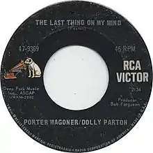 "The Last Thing on My Mind" was covered by Porter Wagoner and Dolly Parton and released as their debut duet single on October 30, 1967, by RCA Victor. Their version peaked at number seven on the Billboard Hot Country Singles chart, the first of an almost uninterrupted string of top ten singles they would release over the next several years.
