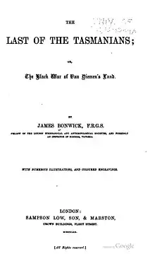 The Last of the Tasmanians; or, The Black War of Van Diemen's Land is an 1870 work of history and anthropology by James Bonwick which chronicles and attempts to explain the demographic decline of the aboriginal Tasmanians in the face of European settlement in the 19th century.[1] The book is illuminated with numerous illustrations and coloured engravings.