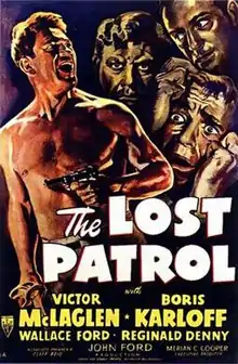 The Lost Patrol is a 1934 American pre-Code war film by RKO, directed and produced by John Ford, with Merian C. Cooper as executive producer and Cliff Reid as associate producer from a screenplay by Dudley Nichols from the 1927 novel Patrol by Philip MacDonald. Max Steiner provided the Oscar-nominated score. The film, a remake of a 1929 British silent film,[2] starred Victor McLaglen, Boris Karloff, Wallace Ford, Reginald Denny, J. M. Kerrigan and Alan Hale.[Note 1]