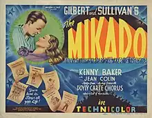 The Mikado is a 1939 British musical comedy film based on Gilbert and Sullivan's 1885 comic opera The Mikado. Shot in Technicolor, the film stars Martyn Green as Ko-Ko, Sydney Granville as Pooh-Bah, the American singer Kenny Baker as Nanki-Poo and Jean Colin as Yum-Yum. Many of the other leads and choristers were or had been members of the D'Oyly Carte Opera Company.[2]