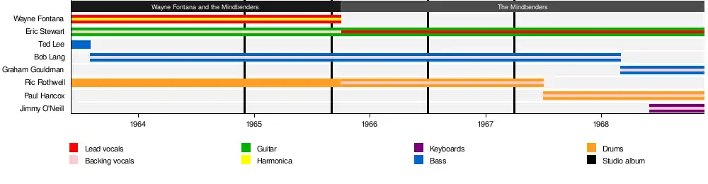 ![]() Wayne Fontana & The Mindbenders in 1965. L-R: Bob Lang, Ric Rothwell, Eric Stewart and Wayne Fontana | |