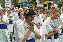 One Solidarity Sister explains: "We have appeared in these costumes a couple of times in Nottingham and in Sheffield. We dress in little white dresses, with one of us in lederhosen and hats and bags. It's about showing solidarity. It's more a sort of universal image. On the bands and the skirts there's lots of images of people holding hands. It's about spreading equality, friendship and acceptance. We look a little bit like aid nurses. Like it's about having a helping hand. Being there to support people. The dresses were made from reclaimed fabrics. They were used for car seat padding. It's good to be reusing stuff."[18]