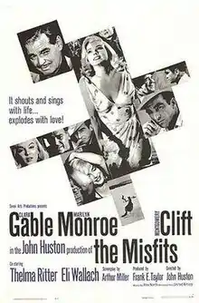The Misfits is a 1961 American Contemporary Western film written by Arthur Miller, directed by John Huston, and starring Clark Gable, Marilyn Monroe, and Montgomery Clift. The supporting cast includes Thelma Ritter and Eli Wallach. Adapted by Miller from his own short story of the same name published in Esquire in October 1957,[4] The Misfits was the last completed film for both Clark Gable and Marilyn Monroe. For Gable, the film was posthumously released, while Monroe died in August 1962 after its release. The plot centers on Roslyn Tabor (Monroe), a newly divorced woman from Reno, and her relationships with friendly landlady Isabelle Steers (Thelma Ritter), an old-school cowboy Gaylord Langland (Gable), his tow-truck driving and plane-flying best friend (Wallach), and their rodeo-riding, bronc-busting friend (Clift).