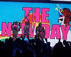 ![]() The New Day (from left to right: Xavier Woods, Big E, and Kofi Kingston) at WrestleMania Axxess in April 2016 | |