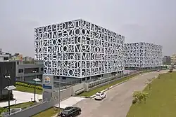 Keeping in mind the location of the school in the Newtown Area of Kolkata, and its simple surroundings, this school needed to make an impact and establish a distinct identity. The locality is planned in a radial grid and the site for the school is curved along the longer edges. Of the 2-acre plot, the school occupies approximately 1,60,000 sq ft. of floor space. Architect Abin Chaudhuri was asked to complete 'the Newtown School’ when construction was already underway.[3] Graphical representations of symbols, alphabets and numbers became an inspiration for the screen. Younger children relate to simple lines as letters of the alphabet and as they grow, abstractions of the same would start to look more like alpha, gamma and pi. Thus, Familiar shapes and symbols were used to create a bespoke stencil screen around the existing unremarkable building mass. The facade not only provides shade to the classrooms from the harsh sun but also lends the school a distinct identity.[4] 488 panels, made of Fibre-Reinforced Plastic (FRP), measuring 3.2 x 3.2 meters envelop each of the two academic blocks. 13 different panels were designed with a combination of small and large alphabets, numbers and symbols. These have been placed in various orientations to achieve a randomized effect on the façade. [5]