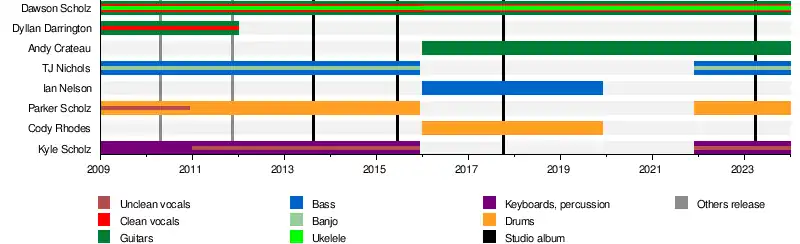 ![]() the band in 2023, from left to right: Parker Scholz, Kyle Scholz, TJ Nichols, Andy Crateau and Dawson Scholz | |