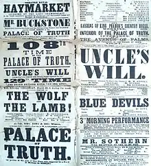 - ↑ An advertisement in The Times, 22 April 1871, p. 8, states that the 135th performance would be the "last but five" and that a new piece would open at the theatre on 29 April. The Times, 2 May 1871, p. 12, confirms that The Palace of Truth had been replaced by other works at the Haymarket and that An English Gentleman by H. J. Byron, starring Edward Sothern, would open on 6 May.