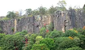 The basalt cliffs are the margin of a diabase sill, formed about 200 million years ago,[3] at the close of the Triassic period by the intrusion of molten magma upward into sandstone.[4] The molten material cooled and solidified before reaching the surface. Water erosion of the softer sandstone left behind the columnar structure of harder rock that exists today. The cliffs are about 300 ft (100 m) thick in sections and originally may have reached 1,000 ft (300 m).