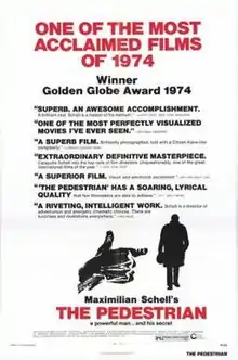 The Pedestrian (German: Der Fußgänger) is a 1973 film directed by Maximilian Schell. It is about the trial of an elderly war criminal. The film was a co-production between companies in Germany, Switzerland and Israel; the movie was distributed in the United States by Cinerama Releasing Corporation.