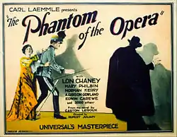 The Phantom of the Opera is a 1925 American silent horror film adaptation of Gaston Leroux's 1910 novel Le Fantôme de l'Opéra, directed by Rupert Julian and starring Lon Chaney in the title role of the deformed Phantom who haunts the Paris Opera House,[1] causing murder and mayhem in an attempt to make the woman he loves a star. The film remains most famous for Chaney's ghastly, self-devised make-up, which was kept a studio secret until the film's premiere. The picture also features Mary Philbin, Norman Kerry, Arthur Edmund Carewe, Gibson Gowland, John St. Polis and Snitz Edwards. The last surviving cast member was Carla Laemmle (died 2014), niece of producer Carl Laemmle, who played a small role as a "prima ballerina" in the film when she was about 15 years old. The film was released on September 6, 1925, premiering at the Astor Theatre in New York. The film's final budget was $632,357.[2]