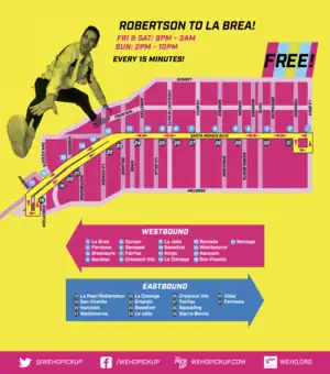 The PickUp runs a single west-east route along Santa Monica Boulevard, starting at the intersection of Santa Monica Boulevard and La Brea Avenue. It then runs west, serving stops on the northern side of Santa Monica Boulevard until the last westbound stop on Ramage Street, where it then turns onto Almont Drive and Melrose Avenue before turning onto La Peer Drive and back again onto Santa Monica Boulevard where, traveling eastward, it then serves stops on the southern side.[11] Buses run every 15 minutes from 8:00 pm to 3:00 am on Fridays and Saturdays, and from 2:00 pm to 10:00 pm on Sundays,[10] complementing existing Los Angeles Metro bus service and giving riders additional transportation options.[5]
