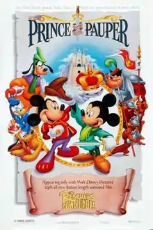 The Prince and the Pauper is a 1990 American animated comedy action-adventure featurette produced by Walt Disney Feature Animation and directed by George Scribner. Featuring the voice of Wayne Allwine as Mickey Mouse, it is inspired by Mark Twain's 1881 novel of the same name. It was Disney's final use of the traditional ink-and-paint and camera process for a theatrical product,[1] before the CAPS digital-ink-and-paint process rendered the traditional techniques and equipment obsolete.[2] Some objects, such as the carriage, were created on computers before being printed out on paper and photocopied onto animation cels.[3] The animation was given a watercolor look and based on Disney's style from the late 30s, influenced by Fred Moore.[4]