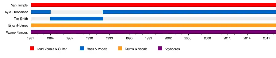 The balding keyboardist Wayne Famous had the goofy, comedic stage presence to contrast with the other rock stars in the band, similar to Rick Nielsen of Cheap Trick.[1] Years ahead of the keytar, he modified the keyboard of an Oberheim OB-X with straps to hold it around his neck allowing him to do a dorky dance center stage. His own invention, he used an umbilical cable to communicate with the remaining electronics off stage, frequently repairing his contraption on stage.