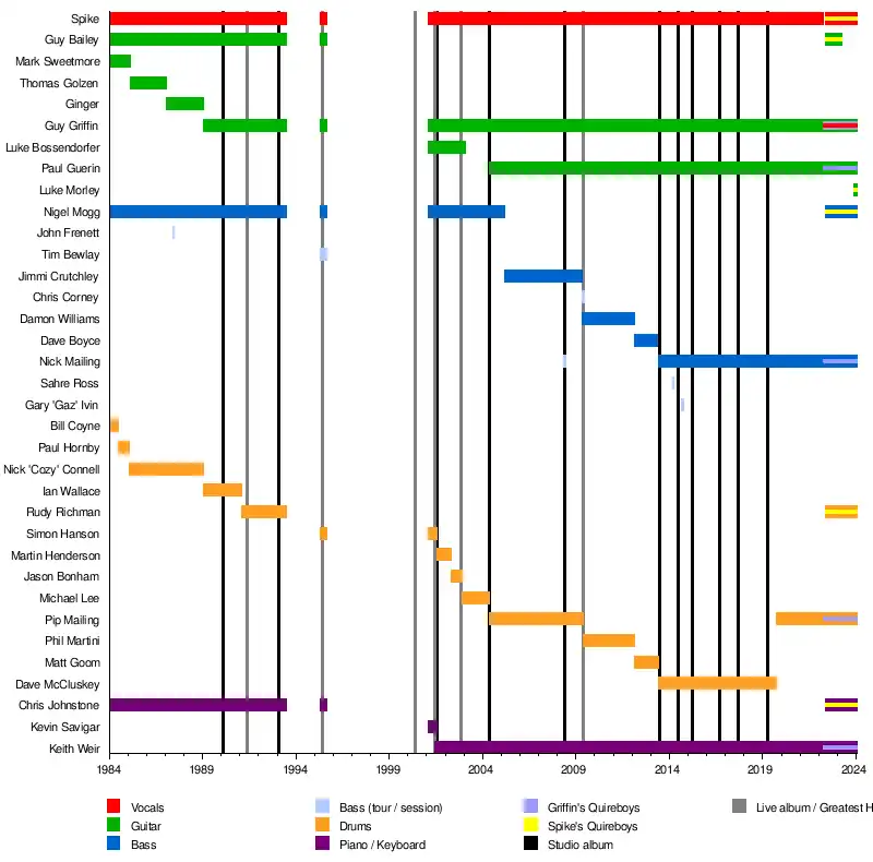 In March 2022, the Quireboys announced that they had released lead vocalist Spike from the band.[18] This sparked a mixed reaction from fans, leading two venues to cancel their upcoming Quireboys dates. However, the band continue to tour with Guy Griffin as lead vocalist.[19] In 2023, they completed tours of Germany and the UK, and performed at Hellfest in Clisson, France.[20]