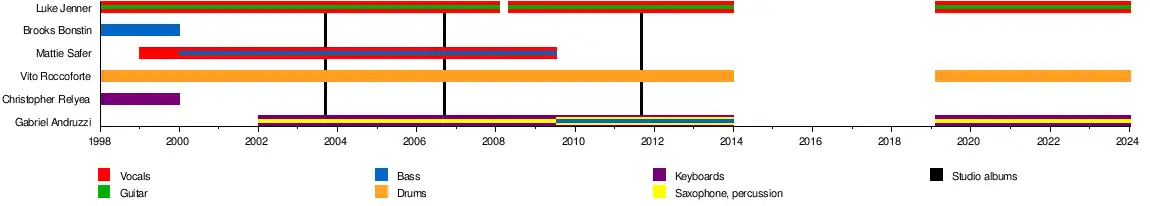 In 1998, drummer Vito Roccoforte and guitarist/vocalist Luke Jenner formed the Rapture.[4] They were childhood friends from a San Diego suburb who started playing music together, and when Roccoforte moved to San Francisco for college, Jenner followed him and they started playing more, which would lead to forming the Rapture.[5] Roccoforte was an aspiring filmmaker, but became a drummer at Jenner's insistence. According to Jenner in 2018, "In college, he got really good grades and had all of these ambitions to be a filmmaker. I kind of railroaded him into the Rapture. He didn’t really want to be a drummer, but I needed somebody I could trust who was never going to leave my side. And he agreed; it’s not like I forced him into it. I asked him humbly and he accepted."[6] They released a single, "The Chair That Squeaks", on Hymnal Sound that same year.[7] After heavy touring, they released a debut mini-album, Mirror, on Gravity Records in 1999.