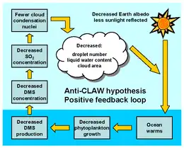 Under future global warming, increasing temperature may stratify the world ocean, decreasing the supply of nutrients from the deep ocean to its productive euphotic zone. Consequently, phytoplankton activity will decline with a concomitant fall in the production of dimethyl sulfide (DMS). In a reverse of the CLAW hypothesis, this decline in DMS production will lead to a decrease in cloud condensation nuclei and a fall in cloud albedo. The consequence of this will be further climate warming which may lead to even less DMS production (and further climate warming). The figure to the right shows a summarising schematic diagram.