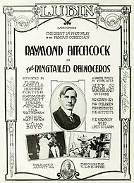 In 1914, the rapidly expanding Lubin Manufacturing Company sought to attract public attention and ticket buyers by convincing stars of vaudeville and the "legitimate" theater, as well as other celebrities, to perform in their first films with Lubin. Two such stage performers contracted by the company in 1914 were the "notorious" actress Evelyn Nesbit Thaw, who made her screen debut in the Lubin production Threads of Destiny, and the comedian Raymond Hitchcock, whose initial foray into films was The Ringtailed Rhinoceros.[5] Widely billed as "'The Funniest Man on the Stage'", Hitchcock had reportedly rejected earlier offers to perform in motion pictures, but the comedian was finally "won over" by Lubin, which created a "unique comedy drama, written especially" for him.[6][7] The Chicago-based trade journal Motography later referred to Lubin's success in contracting Hitchcock for his first screen appearance "a decided triumph".[8]