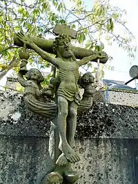 - Another view of the "calvaire" type sculpture. Note the angel with chalice collecting blood from Jesus' feet