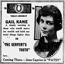 The Serpent's Tooth is a 1917 American silent drama film starring Gail Kane from the stage and released through the Mutual Film company. It is a lost film.[1]