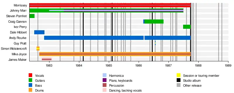 - ↑ Lorraine Carpenter, "Timeline: Johnny Marr – Journeyman Smiths Legend Emerges Solo", Archived 28 August 2005 at the Wayback Machine Exclaim!, February 2003. Retrieved 30 May 2010; and Johnny Rogan, "Mike Joyce Interview", Archived 15 March 2016 at the Wayback Machine Mojo, August 1997. Retrieved 30 May 2010.