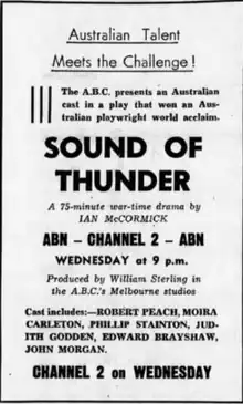 The Sound of Thunder is a 1957 Australian television play by Australian writer Iain MacCormick. It starred Moira Carleton.[2] It was described as "the longest and most ambitious play ABN [the ABC] has put over so far"[1] although The Importance of Being Ernest, which followed on December 18, exceeded it by 12 minutes.