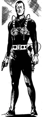 The Spider wears a black form-fitting outfit along with a strange backpack/harness. The harness serves as a jetpack and webshooters, as well as the sources for his web gun and gas gun. He has a large number of gadgets of his own invention at his disposal. His reluctant allies are a pair of freed criminals, the genius 'Prof' Pelham and the safecracker Roy Ordini. They were the only members of his 'army of crime' to stay on after The Spider renounced his criminal ways. Despite this, he treated them very badly and in return they often tried to harm or even kill him. Their failures often brought humiliating punishments from their master.