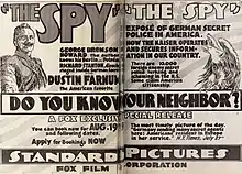 The Spy is a 1917 American silent thriller film directed by Richard Stanton and starring Dustin Farnum, Winifred Kingston, and William Burress.[1] It portrays the actions of American spy who travels to Germany during World War I to get hold of a list of German agents active in the United States. He succeeds with the help of a local woman who falls in love with him, but both are captured and executed.