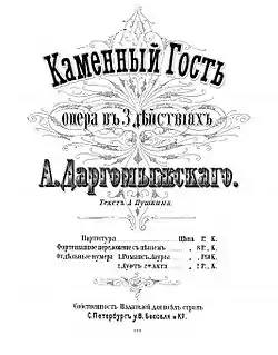 The Stone Guest (Каменный гость in Cyrillic, Kamennyj gost' in transliteration) is an opera in three acts by Alexander Dargomyzhsky from a libretto taken almost verbatim from Alexander Pushkin's 1830 play of the same name which had been written in blank verse and which forms part of his collection Little Tragedies.