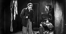 The scene switches to a man sitting in a chair holding a little boy about four or five years old. Another, younger-looking man enters the room through a door on the left of the screen towards another door on the right of the screen. The little boy jumps from the man's arms to the younger man, and the older man reaches out for him; it is here that we see that the older man is blind. The little boy runs to the younger man and grasps his leg, saying, "Daddy!" He looks at him briefly, then makes a hasty exit. The little boy begins to cry and the blind man sits him up on his lap and comforts him, stroking his hair and talking to him. Then the little boy helps the blind man put on his coat and hat to go out.