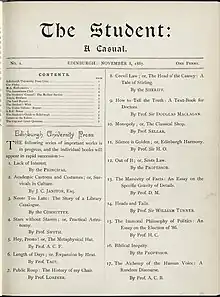 The Student started in 1887 as a small fortnightly magazine, founded by Robert Cochrane Buist.[2][3][4][5] In 1889 the Students' Representative Council took over publishing the paper from Buist.[6][4][5] The Student states that it was founded by Robert Louis Stevenson.[7][8] A typical, turn-of-the-century edition of The Student would open with a short biography of a notable person and an editorial. The remaining content largely comprised notes from various societies, sports results, poetry and literary reviews, and profiles of newly appointed lecturers. The magazine was supported by advertising, but cost two pence.[9]