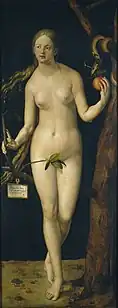 Her face bears elements of idealisation, although for the most part she is presented as a real woman. Her expression, near identical to the 1508 drawing, is difficult to interpret, as it contains none of the passivity, chastity, or sly sidelong glances usually associated with contemporary depictions of her.[5] She is given a monumental and statuesque pose, but without the sense of pagan sensuality present in his 1507 Adam and Eve in the Prado, Madrid.[6] Critics have remarked unfavourably on her sour expression, unnaturally elongated and disproportional figure, and uncomfortable contrapposto pose.[7] The painting has been described as one of Dürer's most unpopular works, with many art historians, including Max Friedländer and Erwin Panofsky, commenting unfavourably on apparent qualities such as "austerity and awkwardness".[8][9] Art historian Fedja Anzelewsky described her as "a parody rather than an exaltation of the classical feminine figure."[10]