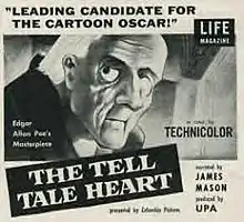 The Tell-Tale Heart is a 1953 American animated psychological horror short film produced by UPA, directed by Ted Parmelee, and narrated by James Mason. The screenplay by Bill Scott and Fred Grable is based on the 1843 short story of the same name by Edgar Allan Poe. The British Board of Film Censors made this the first cartoon to receive an adults-only X certificate in the United Kingdom.